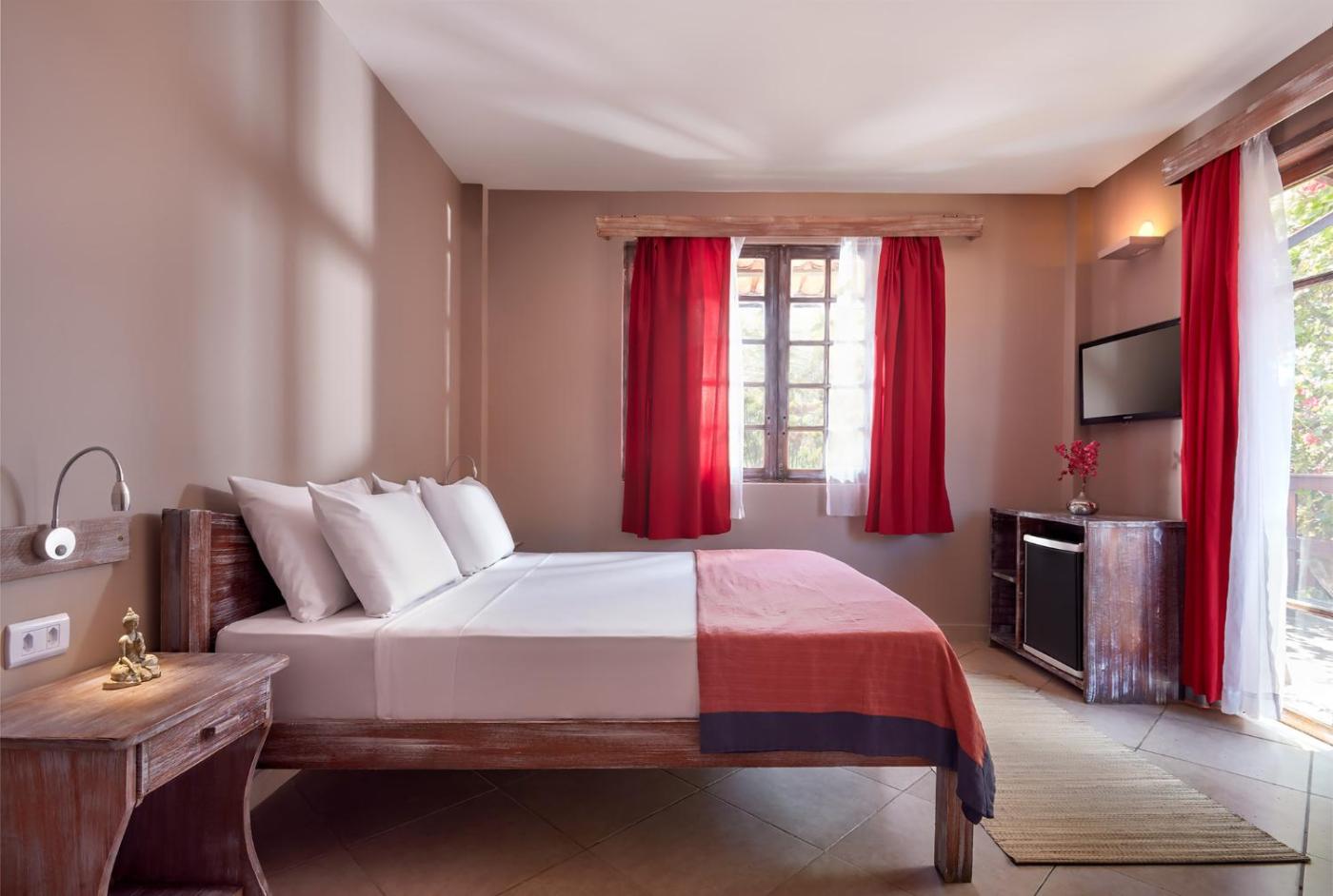 Os quartos têm ar condicionado e vistas para os jardins do hotel.