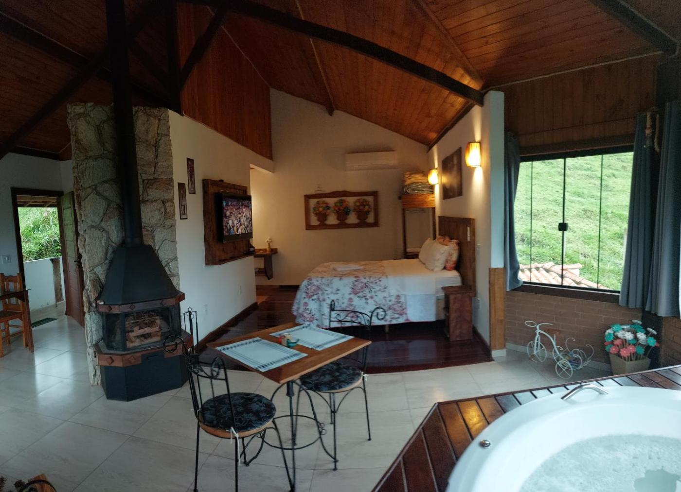 Quarto Queen Deluxe. This luxurious double room offers a hot tub, a sauna and a fireplace. Guests will find a stovetop, kitchenware, an oven and a microwave in the kitchen. The double room also offers a barbecue. The double room provides air conditioning, a minibar, a balcony with garden views as well as a private bathroom featuring a bath. The unit offers 1 bed.